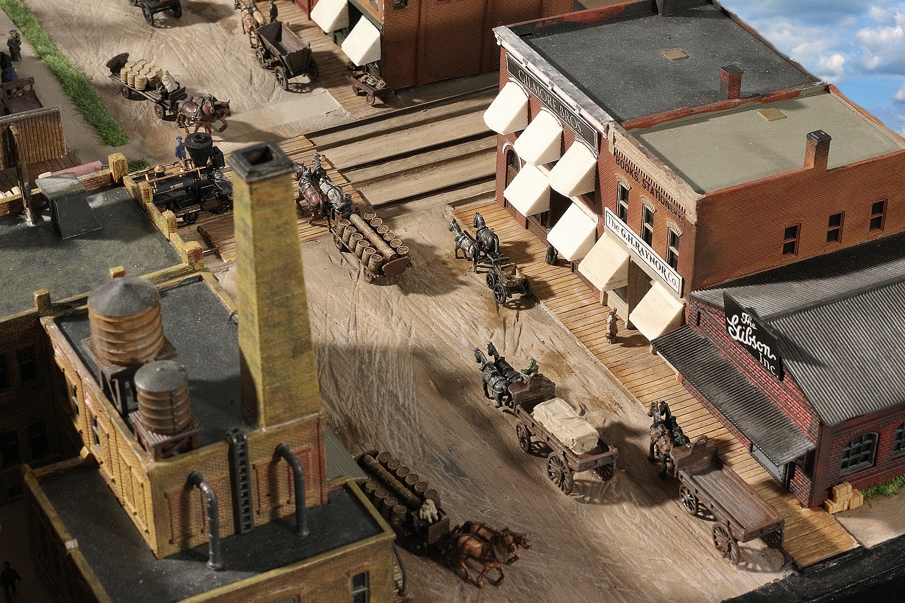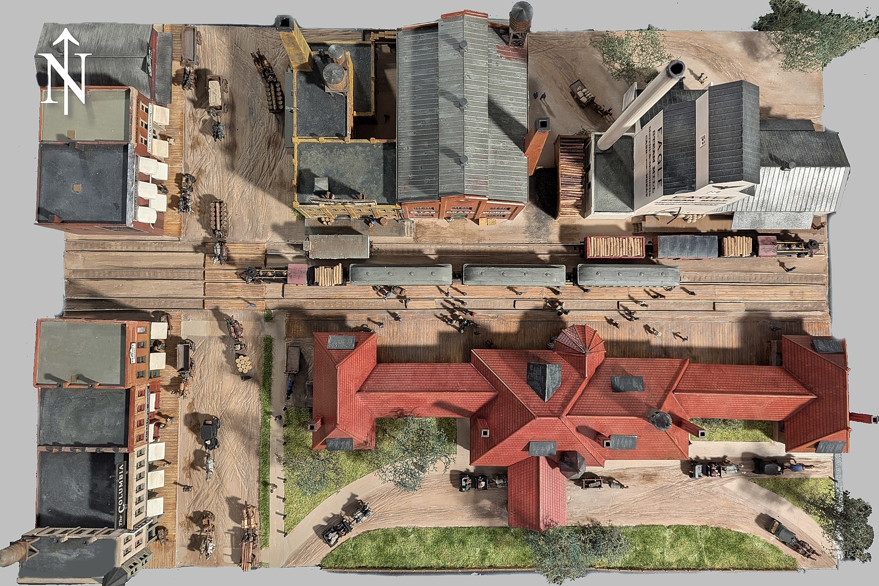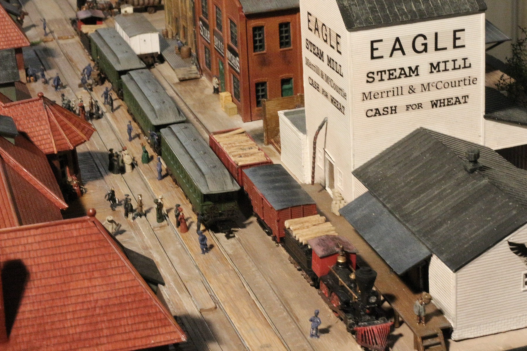 People are standing on the rails. | Eagle Steam Mill | A freight train towards Detroit is loading flour sacks and unloading fire wood. | In the background, a refrigerated car is waiting for beer.
