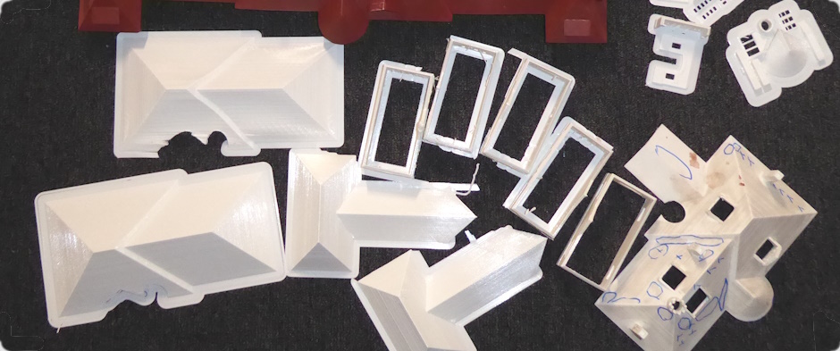 Before assembling the printed parts, some smoothing and sanding is necessary. Then all parts are assembled using superglue. Finally the colors are applied - using paintbrushes only. The roof tiling is made of printed cardboard.