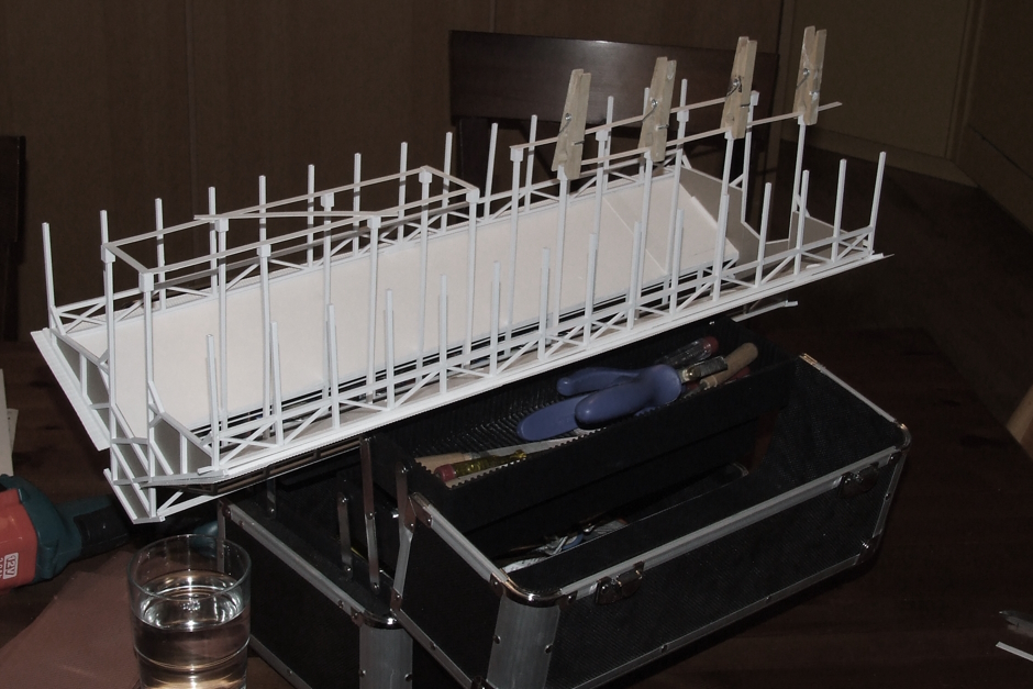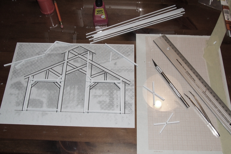 Diese auf dem Dach liegende Halle besteht aus zahllosen maßstabsgetreuen Polystyrol-Quadratstäben. Die Ständer müssen alle parallel und gleich lang sein.