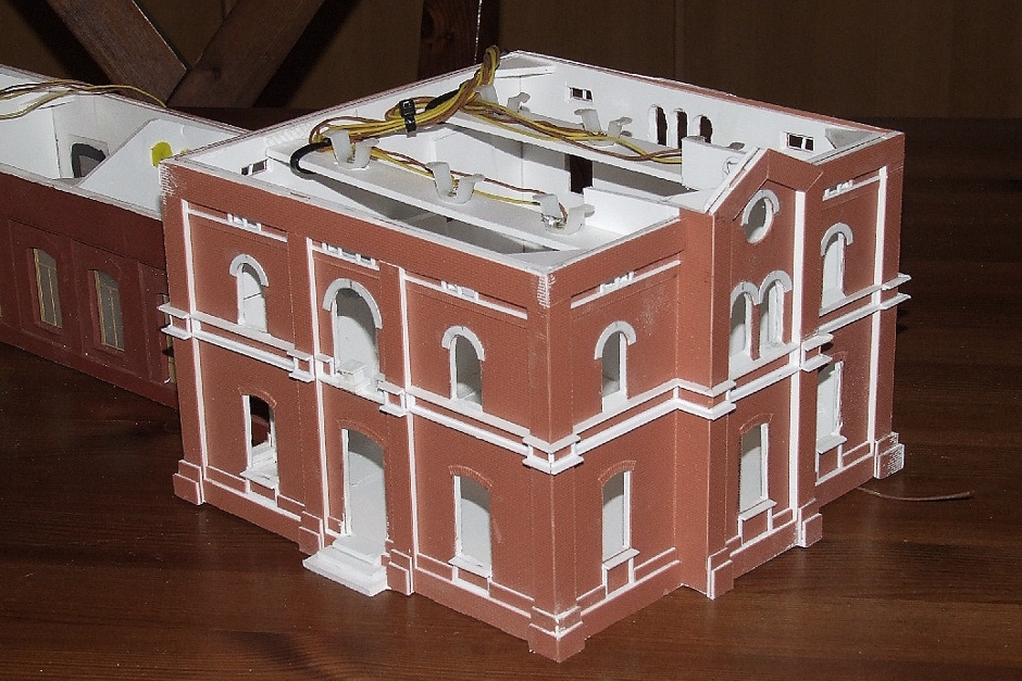 Um die Wandstärke des Gebäudes realistsch darstellen zu können, werden 3-mm-Platten zu einem Gerüst verklebt. Darauf kommen Mauerplatten und Stäbe. Der Rohbau wird anschließend bemalt und leicht gealtert. | Die Fenster sind aus Karton gelasert.