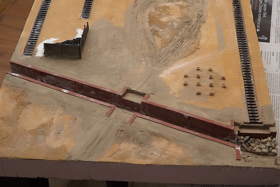 Gips formt die ebene Fläche, mit Dispersionsfarbe als Bergkies und Sand verkleidet. | Später werden die Schienen in den Sand (Gips) eingebettet, wie es damals üblich war.