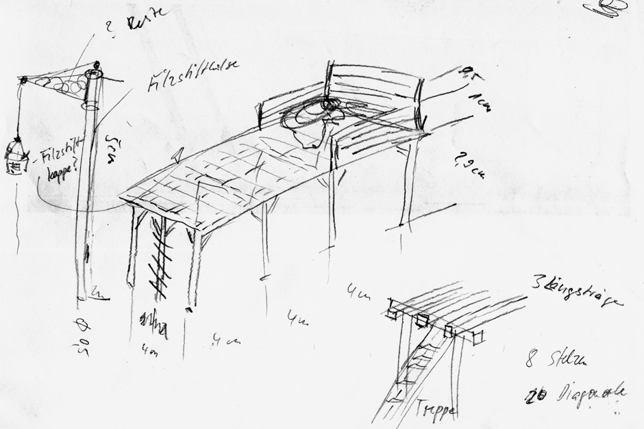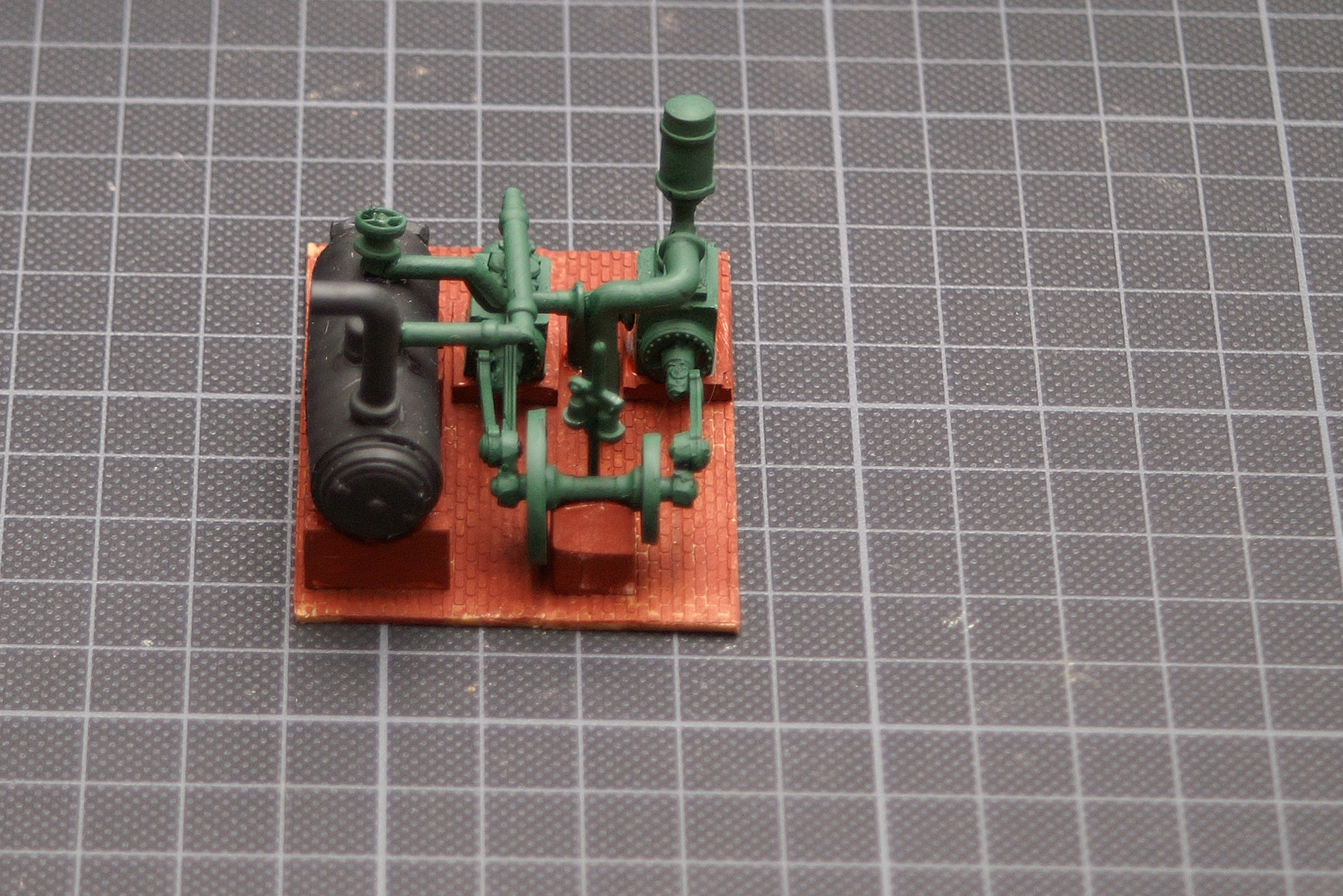 Für das nach Zeichnung angefertigte Dach wurden PVC-Platten mit 240er Schleifpapier beklebt. Die Rauchabzüge sind aus diversen Resten zusammen gestellt.